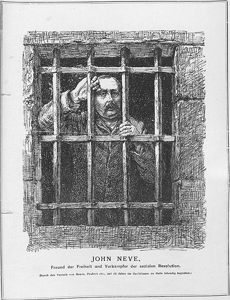 Das erste Jahr seiner Gefangenschaft in Halle konnte Neve in relativer Ausgeglichenheit verleben. Er tischlerte in der Anstaltswerkstatt, und die Briefe, die er zu dieser Zeit noch an seine Freunde senden konnte, zeigen ihn zwar verbittert, aber lassen zugleich auch einen grimmigen Humor erkennen.[44] Dann ging es ihm schlechter. Etwa seit Frühjahr 1889 durchlitt Neve eine fünfmonatige Krankheit und einen entsprechend andauernden Aufenthalt im Gefängnislazarett. Von dort richtete er am 22. September 1889 einen Brief an Sebastian Trunk in London, mit der Bitte, ihn zu besuchen und sich zu diesem Zweck beim Innenministerium für eine Sondergenehmigung einzusetzen. Diesen Brief ließen die Hallenser Gefängnisbehörden offenkundig passieren, denn Trunk antwortete sofort und versprach, in dieser Sache alles Mögliche zu unternehmen.
