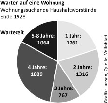 An dieser Stelle ist zunächst ein Blick auf die Höhe der Mieten sinnvoll. Der Altbaubestand (Baujahr vor 1914) war staatlich reguliert. Für die Mieten galten Obergrenzen, in Hamburg etwa durften 1930/31 die Mieten für 2-3 Zimmerwohnungen 124 % der „Friedensmiete“ nicht übersteigen. Das ergab für solche Wohnungen im Altbau eine durchschnittliche Miete von etwa 440 Mark pro Jahr. Für Neubauwohnungen dagegen wurden Kostenmieten kalkuliert, die dann allerdings durch Zuschüsse aus dem Hauszinssteueraufkommen (der Einkommensteuer der Vermieter) „herunterreguliert“ wurden. Sie lagen am Ende mit durchschnittlich ca. 500 Mark pro Jahr für eine kleine 2-Zimmerwohnung von 42 qm dennoch 45-55 % über den Kosten der nach qm-Zahl vergleichbaren Altbauwohnungen. Für den bei Neubauwohnungen zumeist erforderlichen Genossenschaftsanteil sowie einen Baukostenzuschuss waren überdies eine bis anderthalb Jahresmieten aufzubringen. Für einen durchschnittlichen Arbeiterhaushalt (mit Arbeit), der von ca. 4000 Mark Jahreseinkommen rund über 60 % für den täglichen Bedarf aufwenden musste und für Miete nicht mehr als 10 %, also maximal 400 Mark übrig hatte, kamen Neubauwohnungen damit kaum in Betracht. Sie waren eher etwas für Meister, mittlere Angestellte, Beamte des gehobenen Dienstes oder noch kinderlose Paare mit zwei Einkommen.[1]