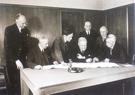 (4) Der 7-köpfige Phoenix-Vorstand 1942: direkt am Tisch rechts Technik-Vorstand Teischinger, neben ihm mit Pfeife Vorsitzender Schäfer, neben diesem links stehend Friedrich. Die Herren Sturm, Stübiger, Kühns und Schmidt harren noch der Identifizierung. Fünf der Abgebildeten wohnten im Pferdeweg-Quartier