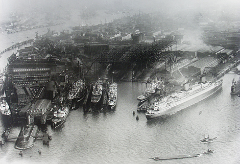 (2) Riggerts Blickrichtung auf Blohm & Voss aus der Flugzeugperspektive – gut eineinhalb Jahre später: Die "Europa", das große Passagierschiff am rechten Bildrand, ist schon wieder da, aber jetzt in Betrieb