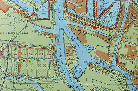 Ein besserer Spielplatz ergibt sich an der Südseite des Blocks zwischen der Straße und ein paar Kleingärten und Buden, vor den letzten Häusern des alten Fischerdorfes, das ehedem zu Altenwerder gehörte. Dann liegt wohl die Nachmittagssonne versöhnend auf den gelbgrauroten Häuserwänden, Bäume grünen, und in den alten Häusern unter moosigen Strohdächern blenden die Scheiben von Licht und Wasser.