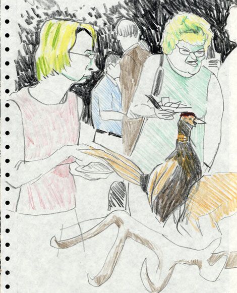 (1) Zeichnung von Angela Jansen nach einem Foto in der taz vom 27. Juni 2006: CDU-Delegierte am kalten Buffet in Trinwillershagen, Nordvorpommern, nach der Nominierung von Angela Merkel als Direktkandidatin zur Bundestagswahl 2005.