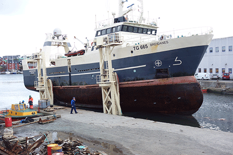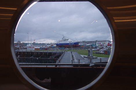 (17) Ein grönländisches Fabrikschiff zur Reparatur in Reykjavik, photografiert durchs Fenster des „Maritime Museum“